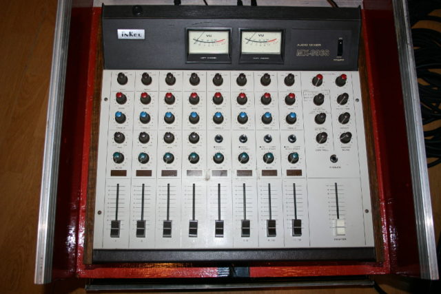 Table de mixage Inkel MX 996S en bon état de fonctionnement, juste une ampoule à changer sur l'éclairage d'un des deux vu-mètre. 8 voies commutables en Micro/ligne/phono et chambre d'echo ajustable sur chaque voie.